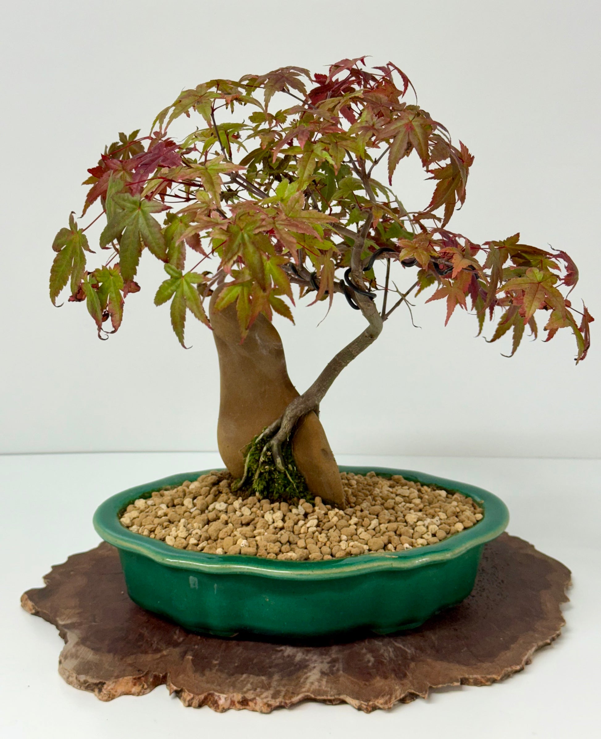 Experience the striking beauty of a Deshojo Maple bonsai growing elegantly over a natural rock, a living sculpture that blends strength and delicacy. Famous for its brilliant spring foliage—vibrant crimson leaves that glow with intensity—this bonsai offers breathtaking color throughout the seasons. Its roots, expertly trained to embrace and cascade over the stone, symbolize endurance and harmony between tree and earth. The contrasting textures of smooth rock and refined maple create a captivating focal point for any display. Carefully cultivated for balance, movement, and character, this Deshojo Maple over rock brings artistry, drama, and serene natural beauty to your space.