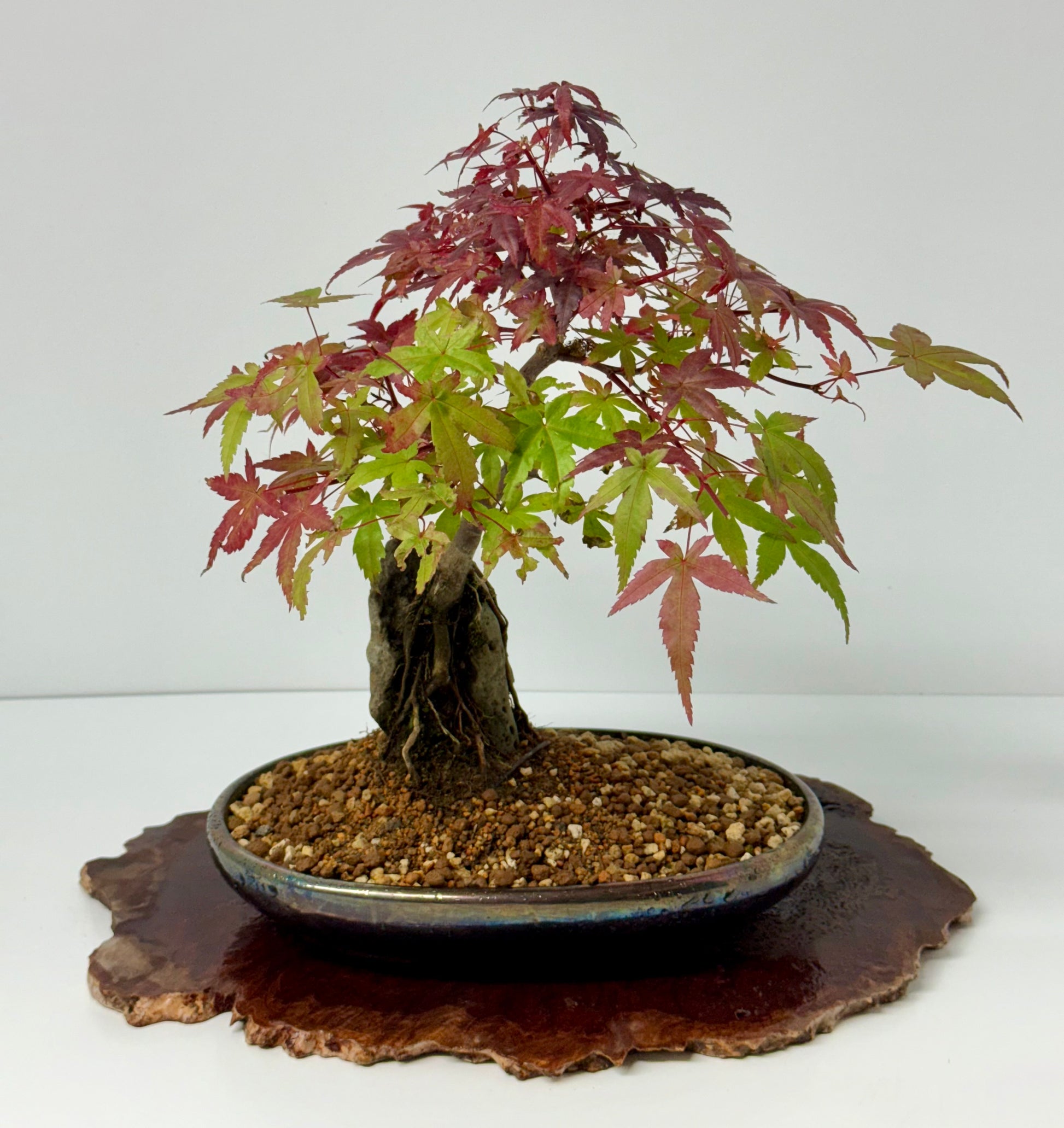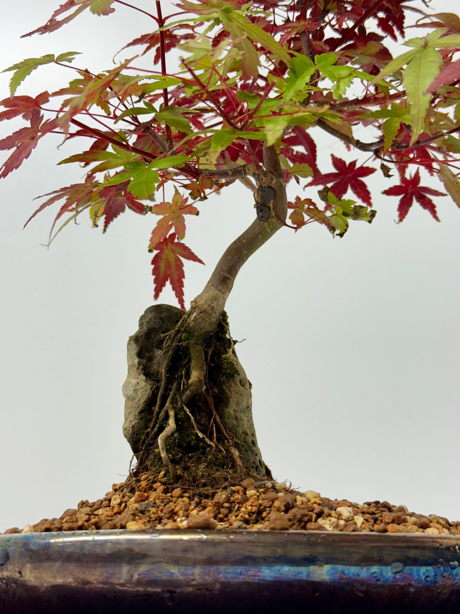 Experience the striking beauty of a Deshojo Maple bonsai growing elegantly over a natural rock, a living sculpture that blends strength and delicacy. Famous for its brilliant spring foliage—vibrant crimson leaves that glow with intensity—this bonsai offers breathtaking color throughout the seasons. Its roots, expertly trained to embrace and cascade over the stone, symbolize endurance and harmony between tree and earth. The contrasting textures of smooth rock and refined maple create a captivating focal point for any display. Carefully cultivated for balance, movement, and character, this Deshojo Maple over rock brings artistry, drama, and serene natural beauty to your space.