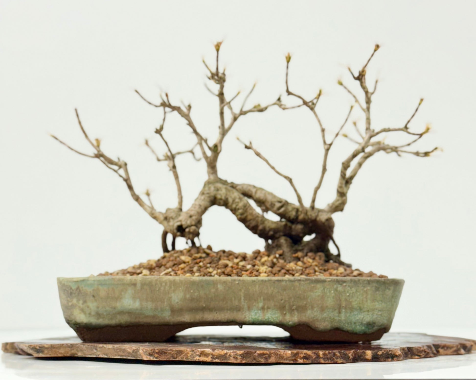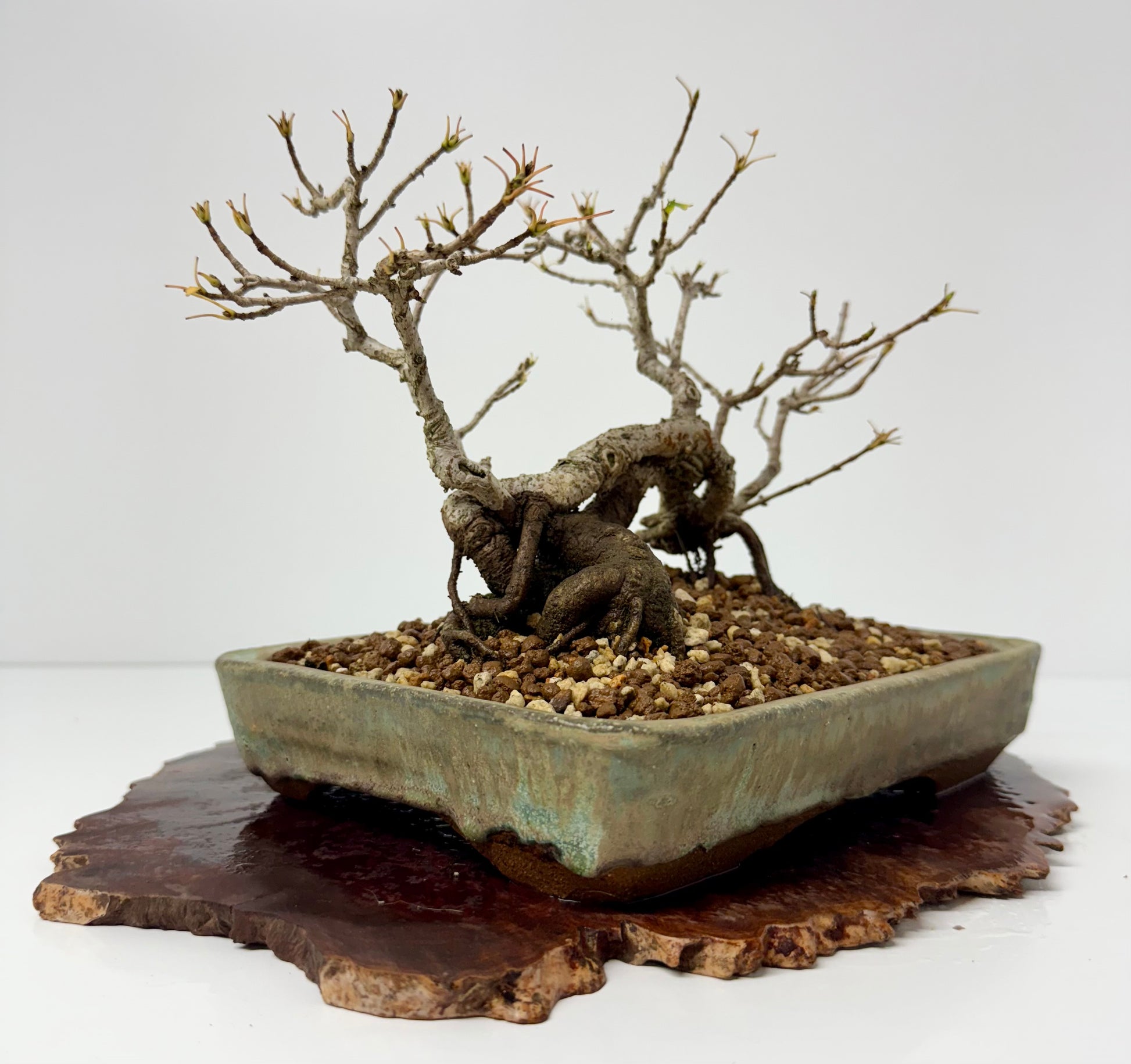 Own this truly unique and exceptional specimen with this fantastic old raft style Field Maple Bonsai Tree (Acer campestre), showcasing decades of character and expert training. This rare raft-style bonsai features a powerful, aged trunk laid horizontally, from which multiple upright trees emerge, creating the illusion of a natural forest formed from a single root system. Valued for its rugged bark, fine ramification, and vibrant seasonal color, the field maple displays fresh green foliage in spring and golden-yellow tones in autumn. Hardy and long-lived, this mature bonsai is ideal for outdoor display and serious collectors seeking a dramatic, museum-quality centerpiece with authentic age, movement, and timeless bonsai artistry.
