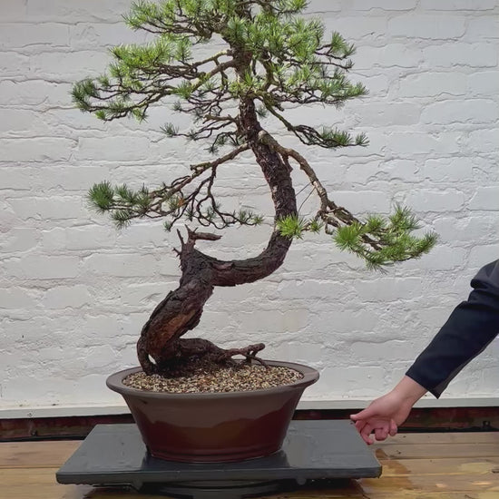 A great Scott’s pine bonsai ( Pinus sylvestris) which has age, movement and good branch placement. The tree has been styled and re potted in 2024 and groaning strongly ready for the next stages of development. Scott’s pines do very well in the Uk climate so will develop far faster than most pine species The tree is Planted in a old high quality unglazed pot with the tree measuring 110cm high x 80cm wide. |